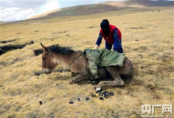 由于藏野驴在坑内卡得时间过长,下半身已僵硬,动弹不得。管护队员们脱下大衣披在了藏野驴身上,等待它恢复体力。
